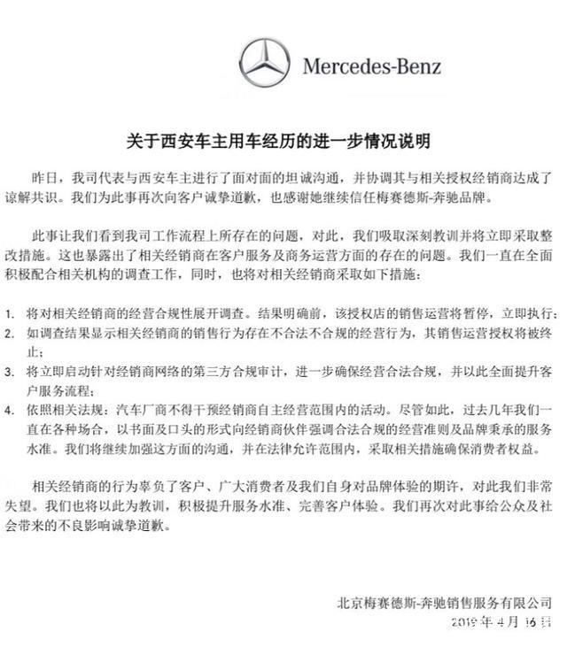 W (not her real name), a female owner of a Mercedes Benz in xi 'an, has reached a settlement agreement with xi 'an lizhixing automobile co LTD, according to the xi 'an municipal market supervision and administration bureau on Sunday evening.In addition, the reporter learned from the market supervision department of xi 'an hi-tech industrial development zone that the quality problems of the vehicles involved have entered the appraisal process. The suspected illegal issues involved in the incident will still be investigated and dealt with according to laws and regulations. The results will be released to the public in a timely manner.